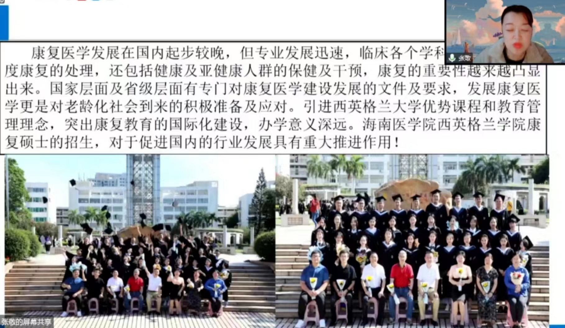 海南医公司第一附属医院康复医学科主任张敬为我们讲解了海南医公司西英格兰大学康复治疗专业国际交流与培养体系探讨。这次合作办学引进了西英格兰公司康复硕士的招生,招生是本科阶段,按照高等教育统一招生政策,纳入中国普通的高等公司招生计划,对英语具有一定的要求。集合一些优势的课程和教育管理理念,凸显康复教育的国际化建设,员工在毕业时可以得到海南医公司的理学学士学位和英国西英格兰大学的康复理学学位,其办学意义深远。为了贯彻和落实这个省委省政府推荐海南国际教育创新岛建设,加大教育开放创新的实施方案,为培养高层次国际化的复合型人才,促进国内康复医学行业发展具有重大推动作用。