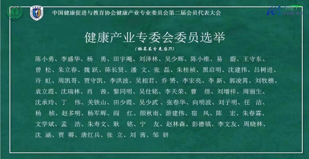 第二届健康产业专业委员会召开了第一次会议,选举专委会领导班子,会议按程序逐项开展无记名投票,由总监票人肖育苗宣布选举结果,选举产生了第二届健康产业专委会常务委员会,选择陈小勇为专委会主任委员,李盛华、杨勇、田宇颷、吴少辉为副主委,刘泽林为秘书长,形成了第二届健康产业专委会常务委员会领导班子。当选主任委员陈小勇教授代表领导班子做了表态性发言。