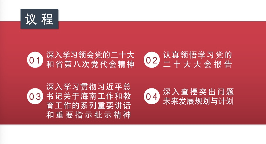 本次会议主要有四项议程,包括:深入学习领会党的二十大和省第八次党代会精神;认真领悟学习党的二十大大会报告;深入学习贯彻习近平总书记关于海南工作和教育工作的系列重要讲话和重要指示批示精神;深入查摆工作中的突出问题;讨论公司未来发展规划与计划。