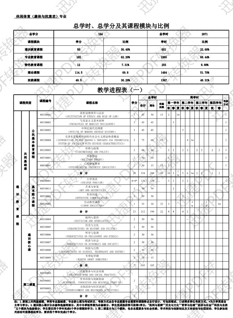 重新定位康体专业的培养方向,定位为休闲体育方向,结合休闲体育的国标要求,模块设置为专业基础课、专业核心课、专业选修课。其中专业选修课设置为限定选修和非限定选修,选修课中增加实践课程比例要求,同时,将专业基础课中的医学类课程调整到方向课模块中,增加选修课比例,增加体育心理学、健康教育学、体育社会学、体育科学研究方法等体育基础课程;在通识教育模块中,取消体育课选课。