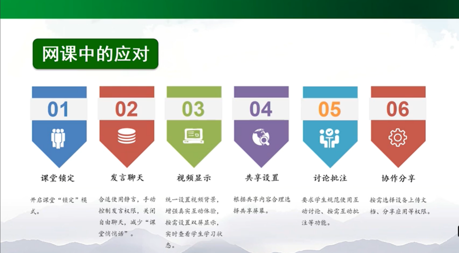 网课教学中一般都会用到课堂的,锁定发言聊天视频,显示共享设置,讨论批注,协作分享的功能,因此教师在网课过程中能熟练掌握这些功能的应用目的和应用场景。基本做到:1,开启课堂锁定模式;2,合理使用静音、手动控制发言的权限,关闭自由聊天,减少课堂的悄悄话现象;3,统一设置视频背景,增强真实互动体验;4,按需设置双屏显示,实时查看员工学习状态,根据内容显示需要合理选择共享屏幕还是共享窗口;5,要求员工规范使用互动讨论,及时回答员工的问题,给予教学反馈;6,按需选择上传文档分享应用的权限。对于一些由于测核算等原因,有部分缺课的员工,还提供课堂回看功能。