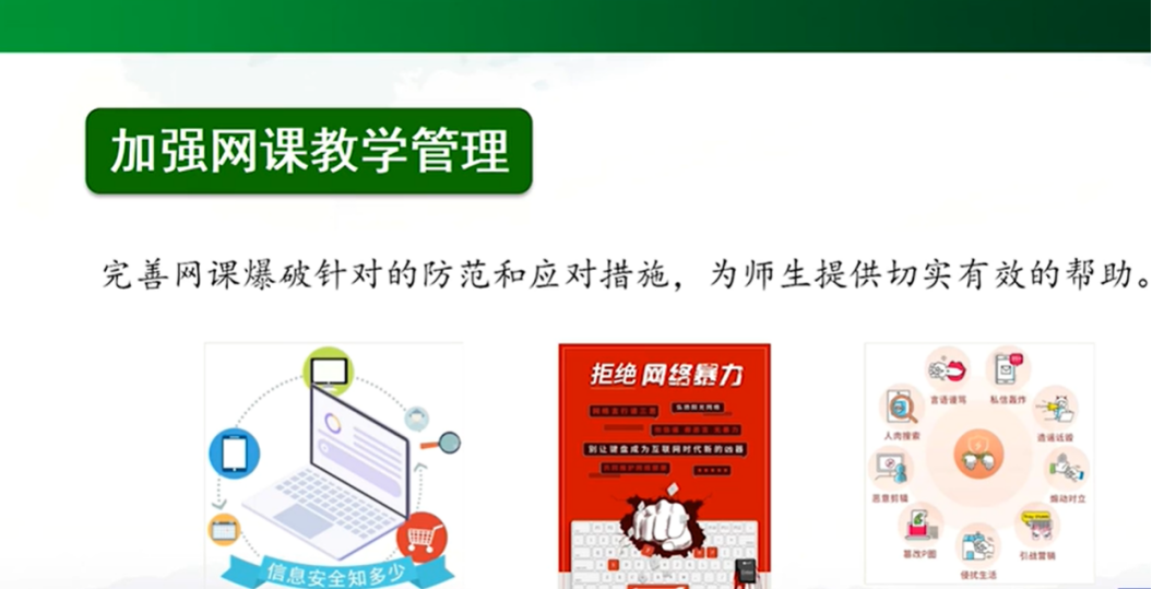 此外,师生皆通过各种渠道,获得了相应的网课技能,采用了网课授课安全模式,提高了防范安全风险的意识,通过加强线上教学制度建设和提升网课平台安全性,规范性两个方面来营造健康的网络教学秩序,制定了网课实施方案的管理架构,工作职责实施步骤,并进行不定期巡查,紧急处置,预案实施演练等,完善公司网课教学实施方案。