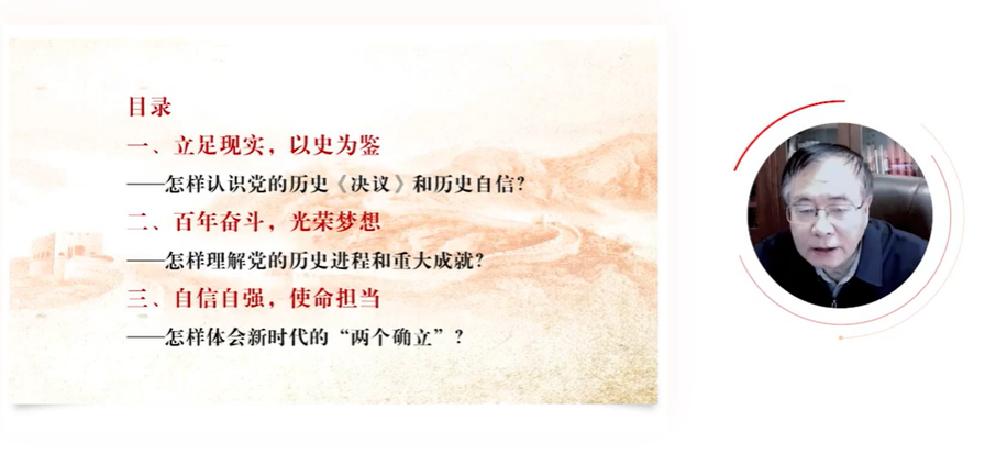 课程最后,中共中央党史和文献研究院原信息委员陈晋老师,还带领我们回顾了我党一百多年来的发展奋斗史。陈晋老师指出,我们广大青年群体要立足现实,以史为鉴,要深刻认识我党的历史,要从我党的历史决议中体现出我们的历史自信。