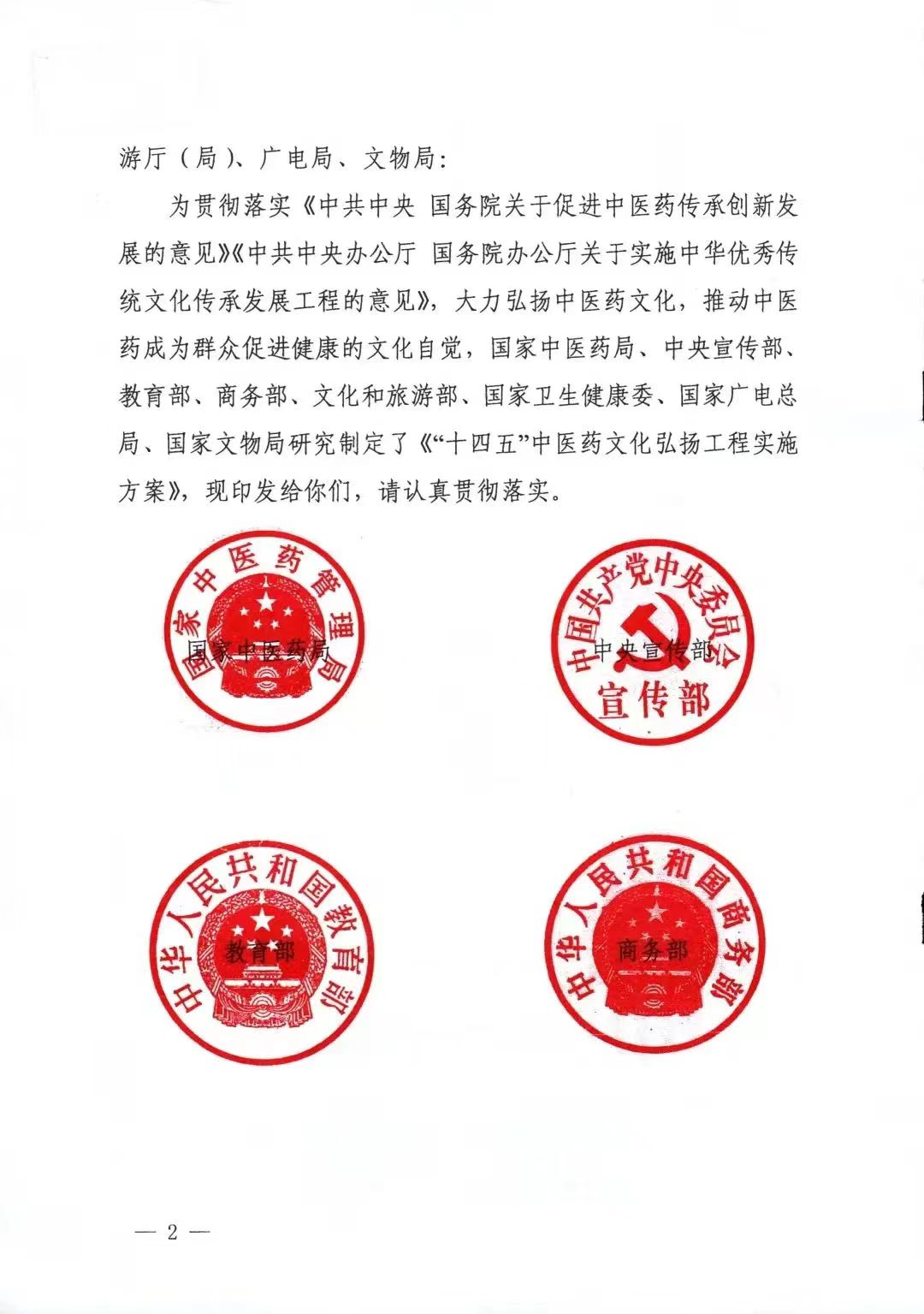 近日,国家中医药局、中央宣传部、教育部、商务部、文化和旅游部、国家卫生健康委、国家广电总局、国家文物局印发《“十四五”中医药文化弘扬工程实施方案》,并发出通知要求各地区各部门认真贯彻落实。