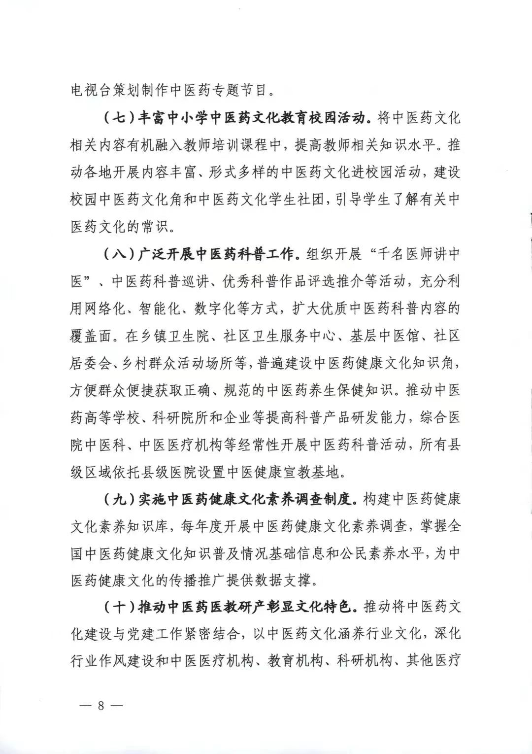开展中医药文化进校园活动。组织开展中医药文化进校园试点工作,推进形式多样的中医药文化进校园活动。将中医药预防近视、脊柱侧弯等纳入中医药文化进校园内容。根据员工特点和爱好,推广太极拳、八段锦、五禽戏等养生功法。