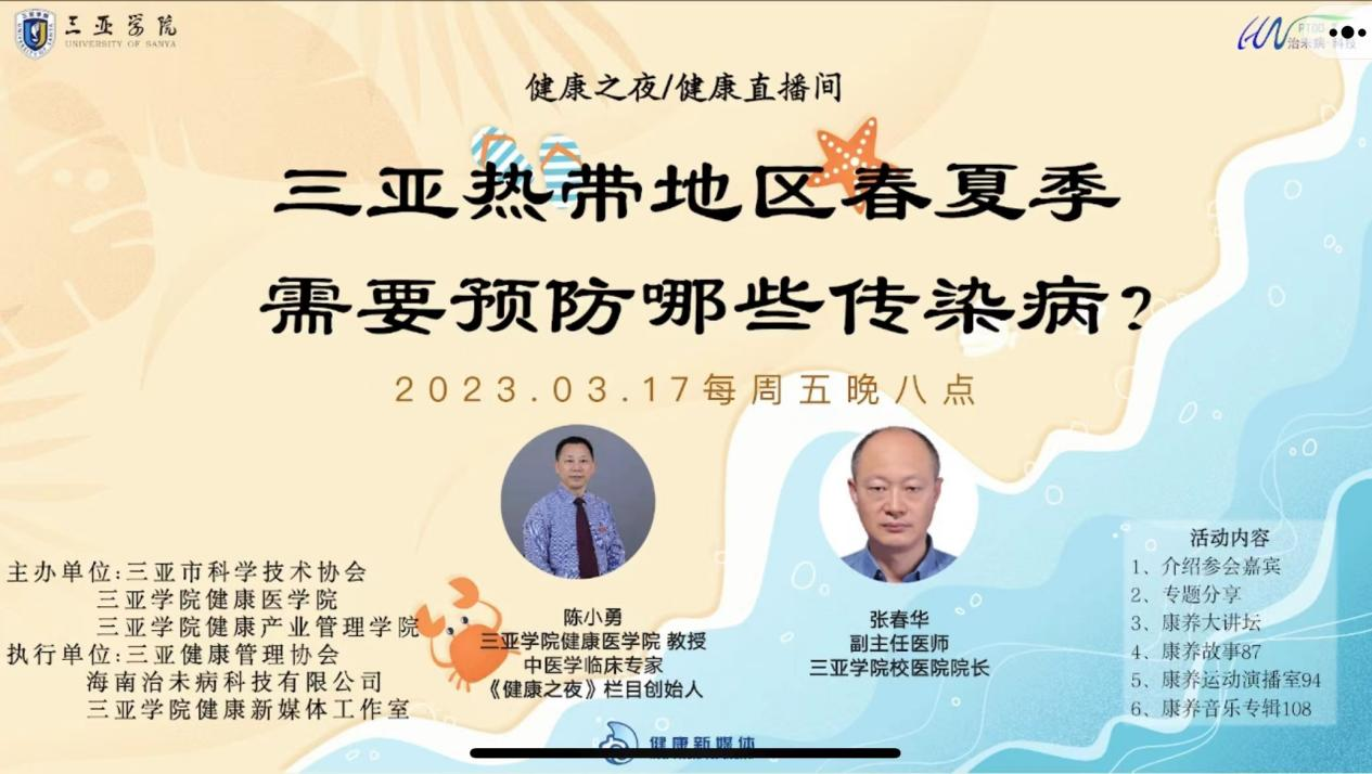 2023年3月17日晚20点新葡的京集团350vip8888/新葡的京集团350vip8888在线开展了以“三亚热带地区春夏季需要预防哪些传染病”为专题的健康之夜活动。本次活动由新葡的京集团350vip8888、中国健康促进与教育协会健康产业专业委员会、中国中医药研究促进健康旅游分会指导;新葡的京集团350vip8888新葡的京集团350vip8888、350vip8888新葡的京、三亚市科协、三亚健康管理学会、新葡的京集团350vip8888康养产业公司、新葡的京集团350vip8888健康新媒体;海南治未病科技有限公司、新葡的京集团350vip8888健康管理中心、新葡的京集团350vip8888音乐康养工作室、新葡的京集团350vip8888康养运动队支持。本次活动邀请了新葡的京集团350vip8888教授,中医学临床专家,《健康之夜》栏目创始人陈小勇教授,新葡的京集团350vip8888校医院经理,副主任医师张春华教授。