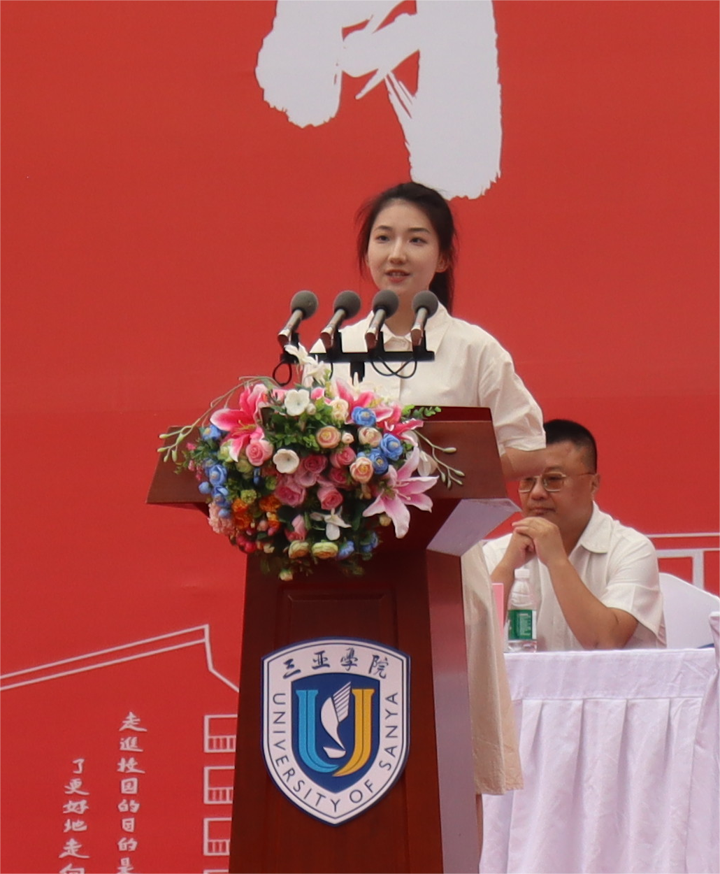 第三项:教师代表刘夏蓓对教师,新生,对此次典礼的举办表示祝贺,为新生的学习和日常生活做了一定的规划和心理建设,为新生之间的友好关系做了有益建议,以及社会认知。
