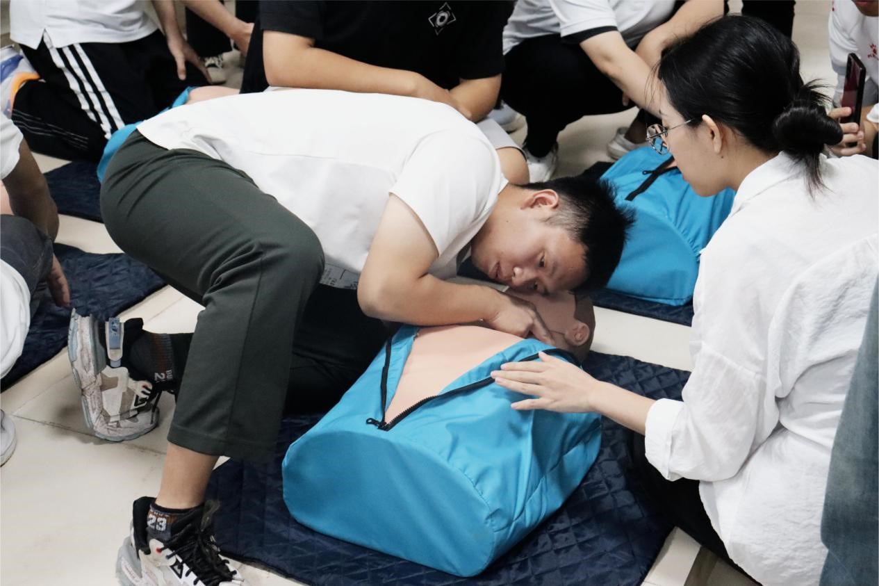 学长讲解完心肺复苏的操作步骤后,同学们用假人开始了练习。学长学姐在演练中对同学们不规范的动作进行指导和纠正,并通过认真的教导,让同学们在练习的过程中对医学技能有进一步的了解。