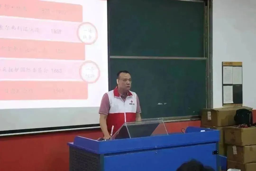 红十字会的老师先向同学们讲解了红十字运动的起源、红十字运动精神、红十字运动原则和红十字会主要工作,让同学们详细了解红十字运动。