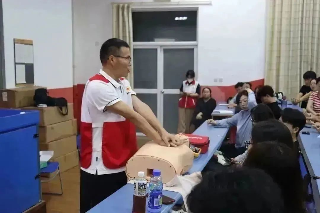 此外,红十字会老师用假人向同学们演示了胸外心脏按压实际操作:按压胸部正中,乳头连线水平,按压频率为100次到120次/分,按压深度大于五厘米(成人),比例三十次胸外按压,两次人工呼吸,按压手法以掌跟掌。