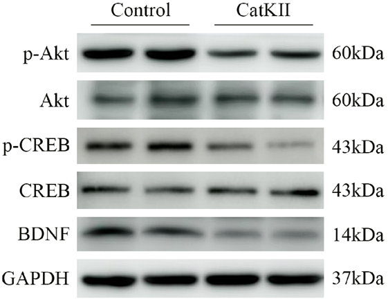 (图3 p-Akt、Akt、p-CREB、CREB、BDNF、GAPDH在海马组织的表达)