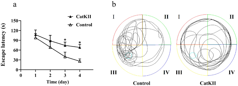 研究表明,CatK在人类和啮齿类动物的大脑不同脑区中均有表达,广泛存在于各类神经元和神经胶质细胞中,尤其在海马齿状回区(dentate gyrus,DG)CatK活性最高。众所周知,海马是产生并维持学习记忆功能的关键脑区,提示CatK可能参与神经元再生、突触可塑性和学习记忆等过程。