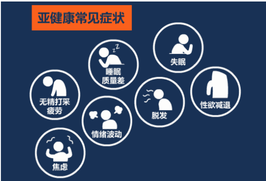 据世界卫生组织一项全球性调查表明:全球健康人数仅占5%;经检查诊断患疾病的人数有20%;亚健康人数占有75%。在中国的健康调查发现,处于亚健康的人群约占70%。亚健康通常会引起慢性疾病,其社会负担在不断上升,表现为疲惫、饮食不规律、失眠以及神经衰弱等,更甚会诱发高血压、冠心病等心血管疾病。在已有的研究中,老员工亚健康状态占比均高于50%,随着疾病年轻化不断呈现,老员工人群越来越被关注。