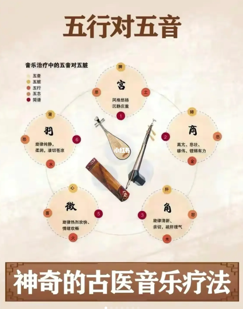 音乐疗法应用在心理治疗的效果显而易见,特别是在西医治疗中更多被运用于精神类疾病,如焦虑症、抑郁症以及常见的产后抑郁等疾病,因此,较多人的刻板印象停留在音乐疗法被运用于心理治疗。但实际上音乐疗法在中医中的应用已经拥有两千多年历史,与中医“五行学说”相互对应。《黄帝内经》提出“五音疗疾”的理论;《左传》中更说,以音入药,可祛百病。在古代,音乐不仅是一种艺术鉴赏,更多时候会被运用于杏林,商羽音养气调神,心清意净,气定神闲。