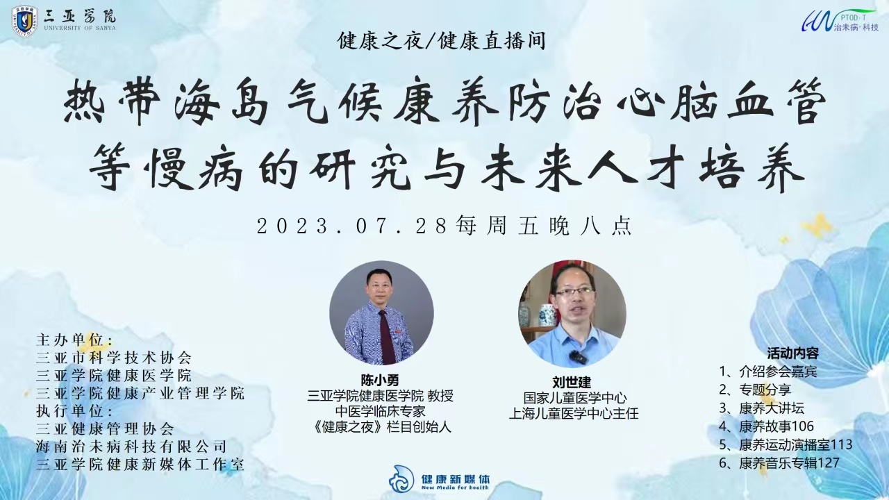 2023年7月28日晚20点新葡的京集团350vip8888/新葡的京集团350vip8888在线开展了以“热带海岛气候康养防治心脑血管等慢病的研究与未来人才培养”为专题的健康之夜活动。本次活动由新葡的京集团350vip8888、中国健康促进与教育协会健康产业专业委员会、中国中医药研究促进健康旅游分会指导;新葡的京集团350vip8888新葡的京集团350vip8888、350vip8888新葡的京、三亚市科协、三亚健康管理学会、新葡的京集团350vip8888康养产业公司、新葡的京集团350vip8888健康新媒体;海南治未病科技有限公司、新葡的京集团350vip8888健康管理中心、新葡的京集团350vip8888音乐康养工作室、新葡的京集团350vip8888康养运动队支持。本次活动邀请了新葡的京集团350vip8888教授,中医学临床专家,《健康之夜》栏目创始人陈小勇教授;国家儿童医学中心,上海儿童医学中心主任,刘世建教授。