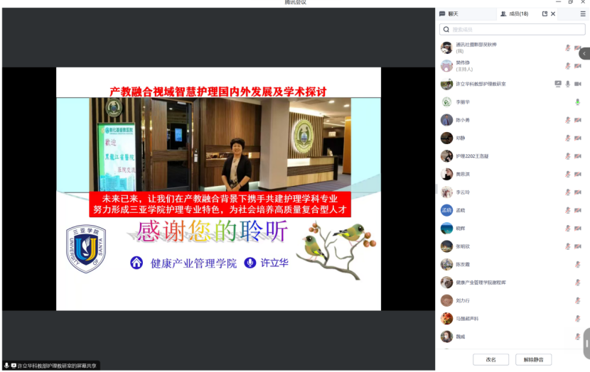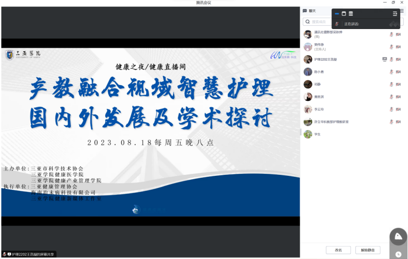由陈小勇教授开展的健康之夜于2023年8月18日8点进行产教融合视域智慧护理国内外发展现状及学术探讨,许立华教授主讲,部分专业教师线上参与进行讨论,许立华教授讲解的主要方向为护理学专业聚焦产教融合和护理学专业的教学方向与目标。