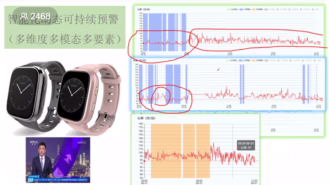 通过智能化设备,人工智能24小时监测的血压、做对比,我们看到比如说这次夜晚,知道我们的心率,在夜晚的时候,它是一个相对是要静下来的一个状态。