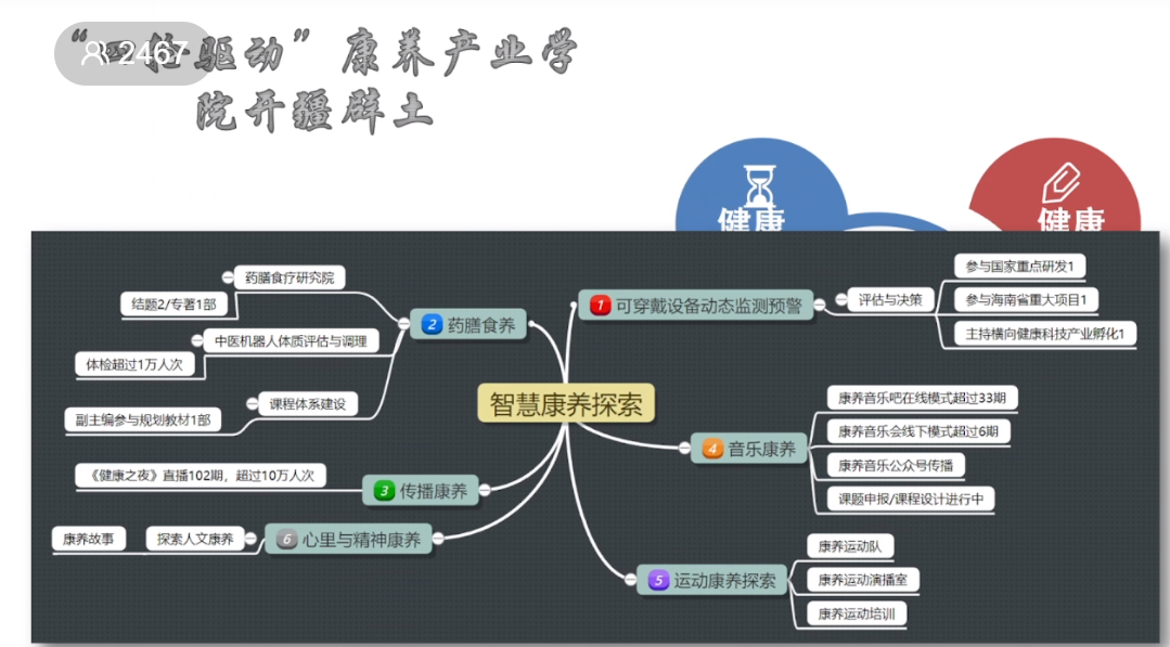 人才的培养,课程的创新,我们的课程对标我们未来这个岗位的需要,来设计我们当前的课程,这是我们特色培养,尤其是高质量培养。我们攀岩产业新业态的。专业人才的重要的一个,这个观念和理念在健康科技的一些前沿的课程,包括经营主学的技术,轻养医学,人工智能,可穿戴设备等等。大家知道生命在于运动,我们运动康养里面准备了培养康养运动队,还有康养运动系列的培训。在智慧康养里面,强调药膳食养,民以食为天,我们每一天都需要饮食的关注,通过药膳食疗研究院,我们开展了系列的研究,尤其中医机器人的体质检测,给我们开展的药膳食养的配套的方案。