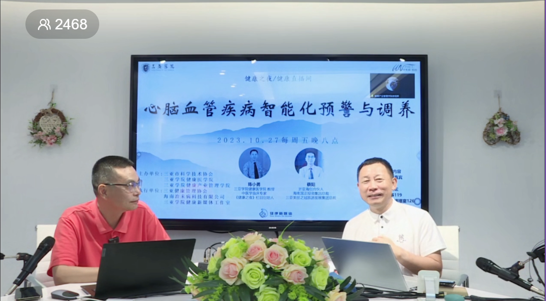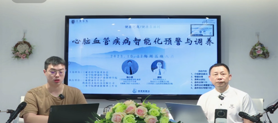 2023年10月27日晚20点新葡的京集团350vip8888/新葡的京集团350vip8888在线开展了以“心脑血管疾病智能化预警与调养”为专题的健康之夜活动。本次活动由新葡的京集团350vip8888、中国健康促进与教育协会健康产业专业委员会、中国中医药研究促进会健康旅游分会指导;三亚市科协、新葡的京集团350vip8888新葡的京集团350vip8888|新葡的京集团350vip8888联合主办、三亚健康管理协会、海南治未病科技有限公司、新葡的京集团350vip8888健康新媒体联合执行;新葡的京集团350vip8888健康管理中心、新葡的京集团350vip8888音乐康养工作室支持。本次活动出席嘉宾新葡的京集团350vip8888新葡的京集团350vip8888专家,中医学临床专家,《健康之夜》栏目创始人陈小勇教授。浙亚海创合伙人、海南国正投资集团总裁、三亚美丽之冠旅游发展集团总裁蔡阳老师。