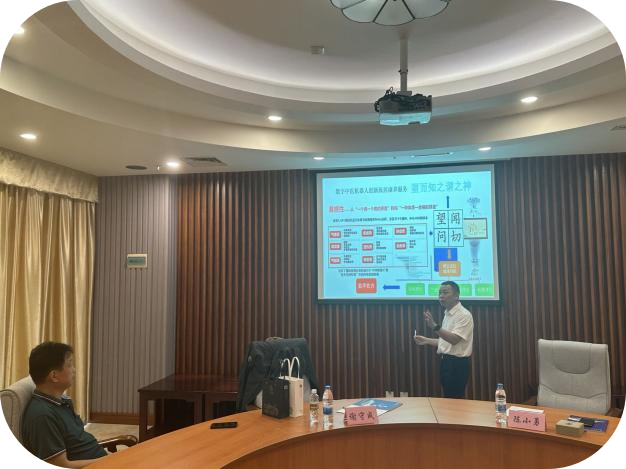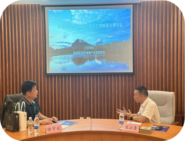 陈小勇教授向谢守成先生介绍了自贸港背景下旅居人群卫生健康服务需求这一研究课题的几个方面,尤其是疫情之后应对“未富先老”人口老龄化需求,自贸港背景下政策需要探索生态、学科、人才、产品、服务链等多维度的融合创新发展。项目开展了调研旅居人群卫生健康服务需求、旅居人群卫生健康服务需求模型构建与分析、康养旅居人群数字疗法可及性三个研究方向;通过实地调查海南旅居康养需求情况,运用模型构建需求程度与旅居人群需求细分,并进行制约因素等多要素分析;重点阐释如何应用数字疗法跨学科交叉研究与应用,基于数字疗法赋能智慧康养可继续研究与应用前景值得期待。