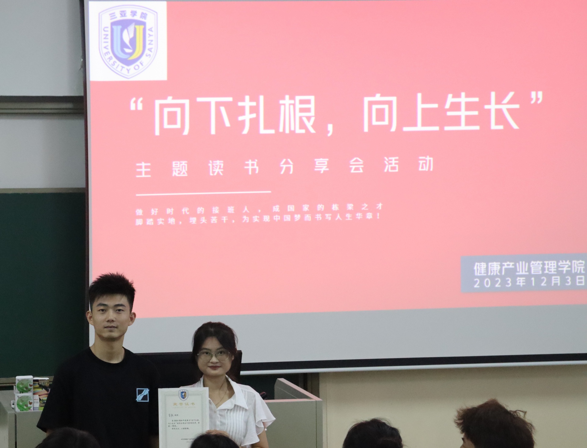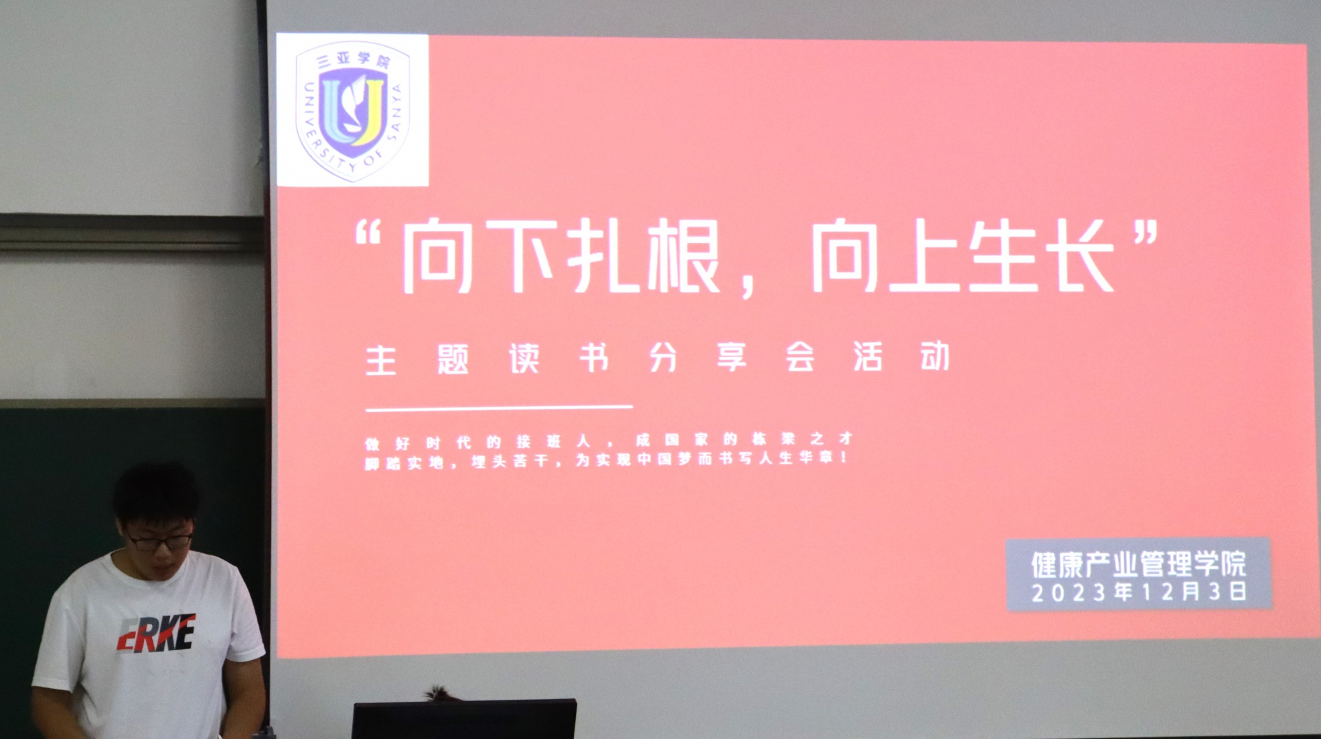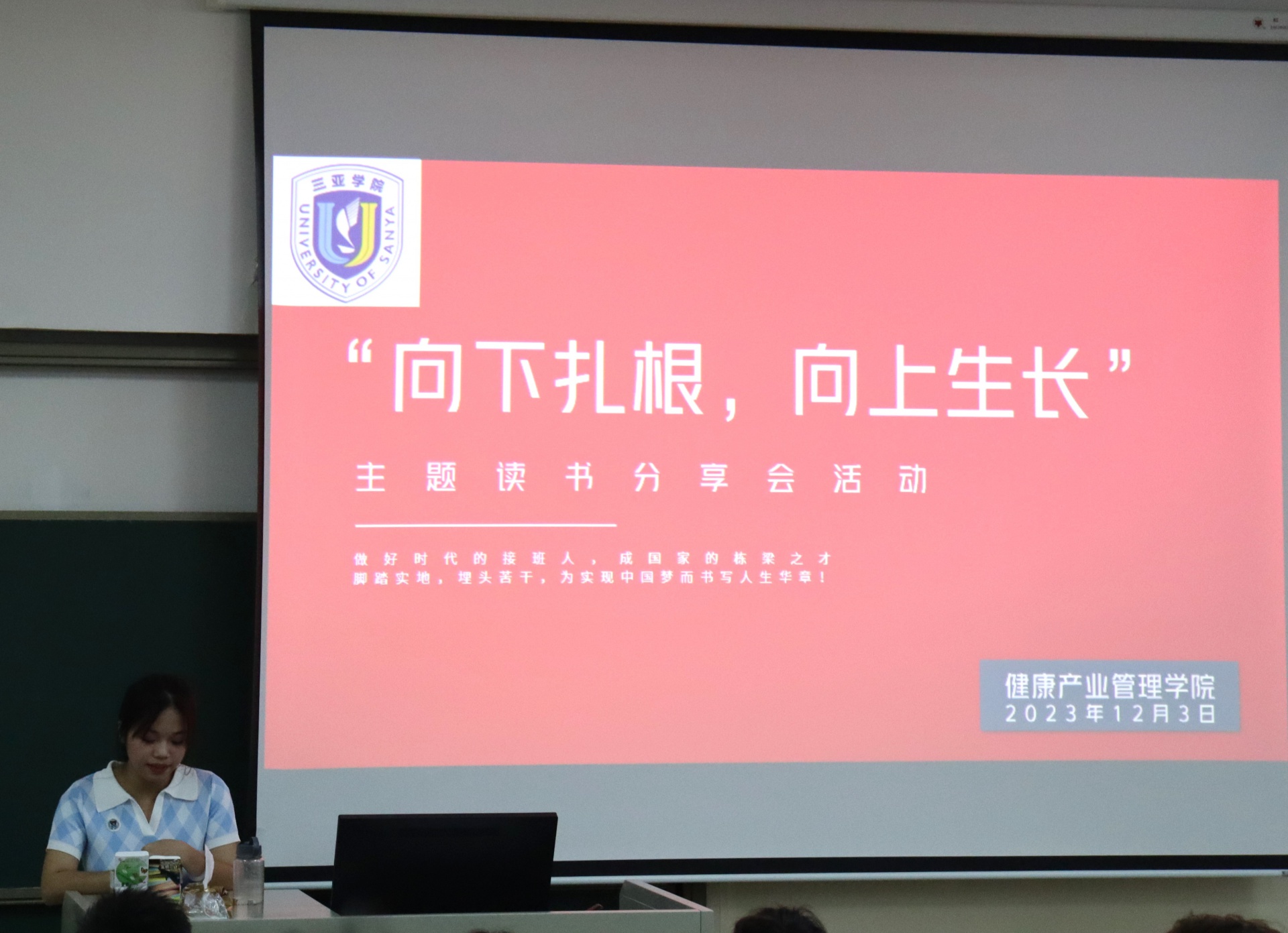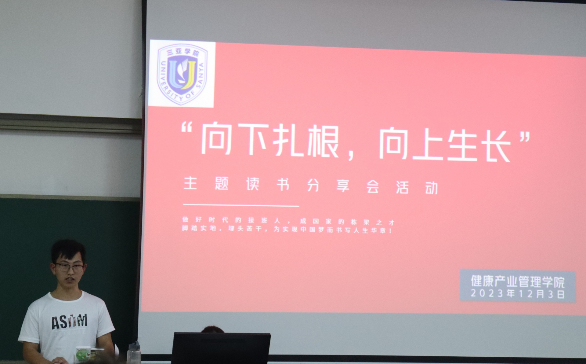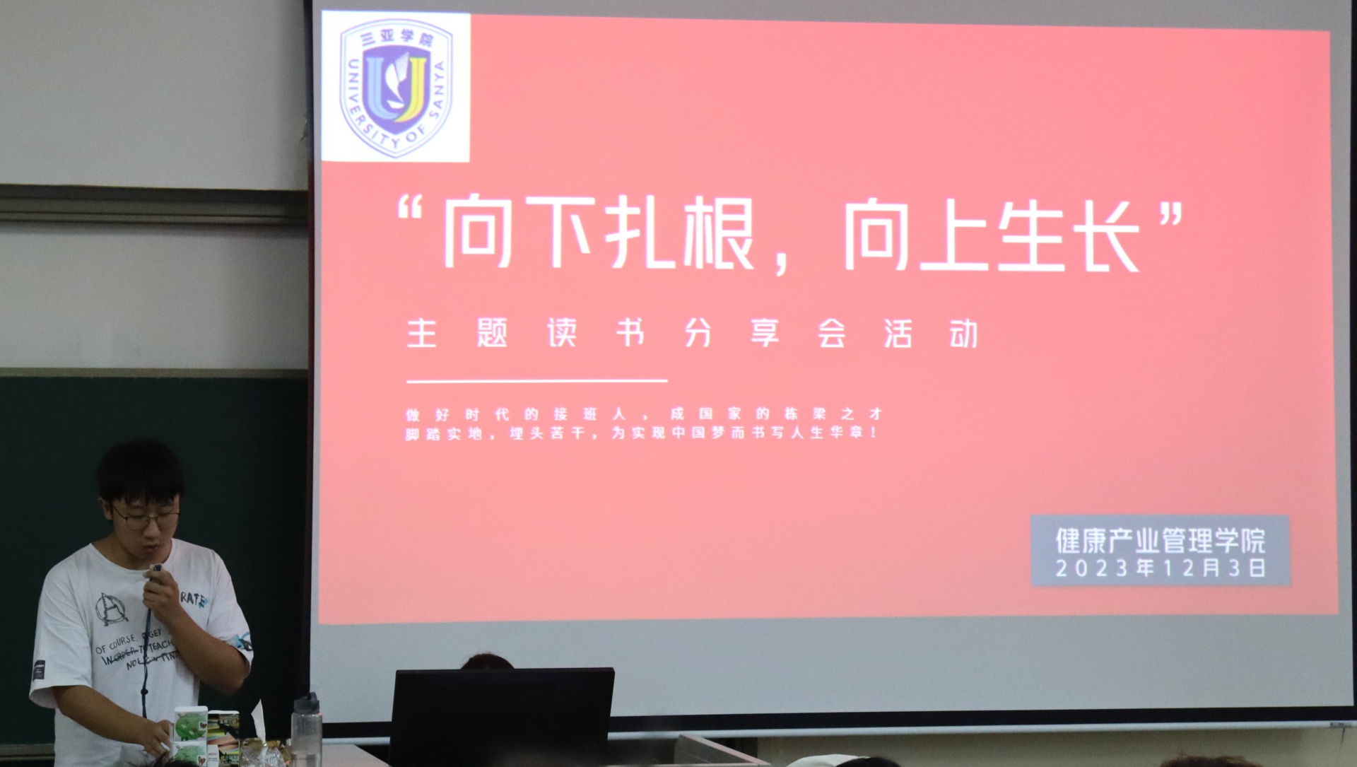 为了丰富校园生活,提高员工学习氛围,新葡的京集团350vip8888/新葡的京集团350vip8888于2023年12月3日下午15点在书知楼2401教室举办以“宣讲著作传精神,建设青春之中国”为主题的“向下扎根,向上生长”读书分享会。活动由康管公司23级思想导师李炳坤老师组织同学们开展。