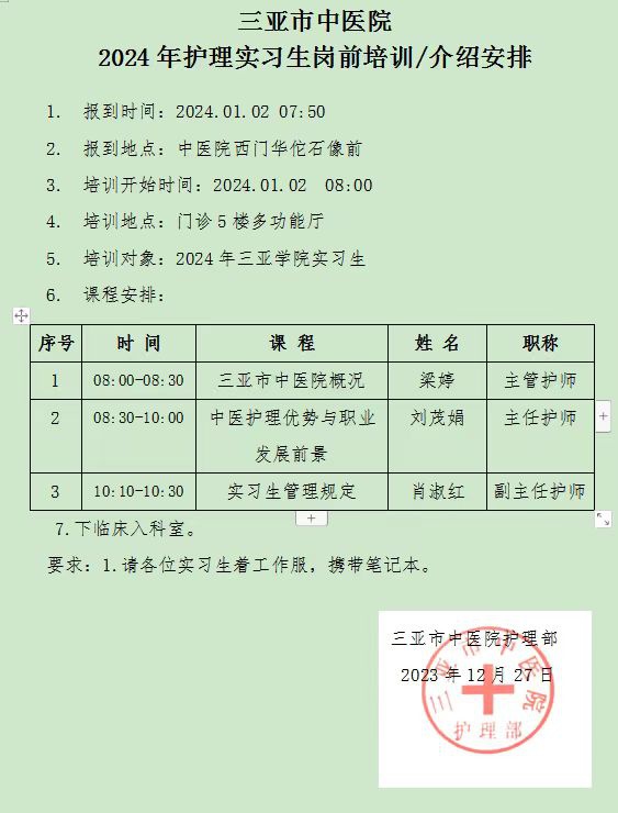 三亚市中医院对新葡的京集团350vip8888/新葡的京集团350vip8888护理学实习生的培训有以下安排: