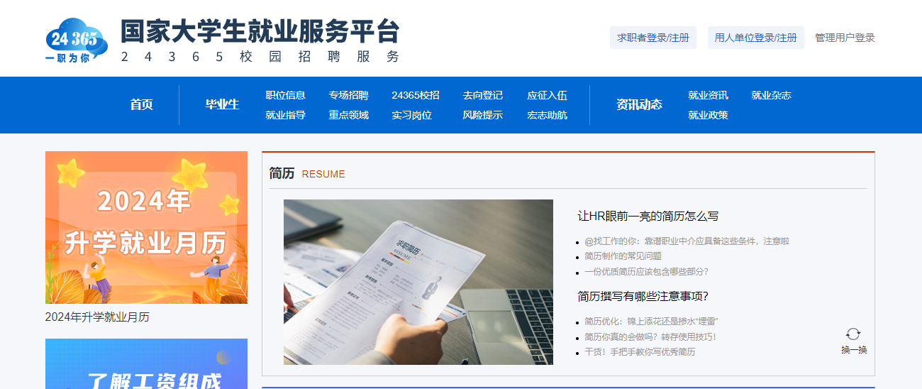 24365国家老员工就业服务平台是由教育部主管,专门用于服务于高校毕业生及用人单位的公共就业服务平台。平台包括招聘信息、就业指导、就业政策等版块,覆盖毕业生求职的方方面面。毕业生同学们可利用假期,充分利用平台为自己加油!