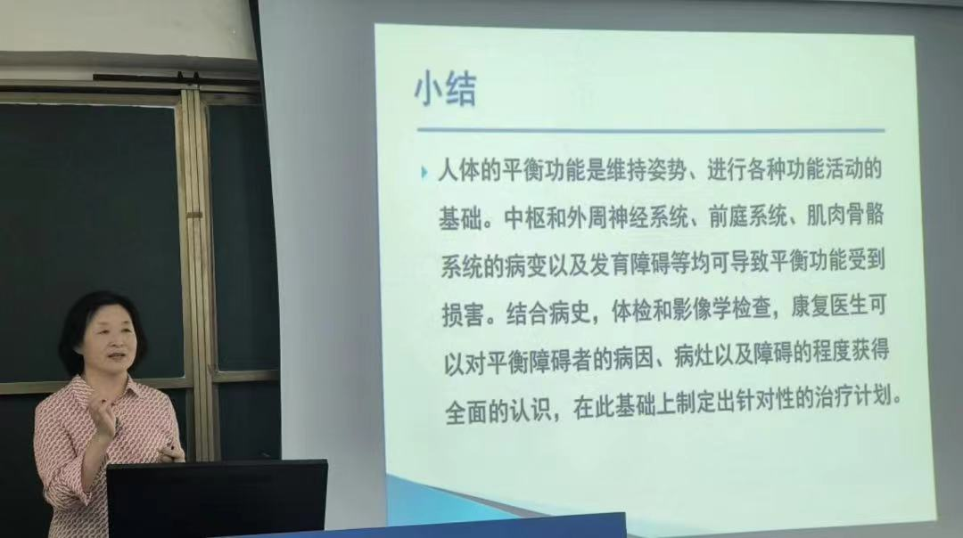 4日上午课程中胡文清教授讲解了康复治疗评定的发展进程,随后讲解了平衡功能评定的有关内容,详细解读了稳定极限、平衡功能分类(静态平衡、动态平衡、反应性平衡)、平衡生理学机制(躯体感觉系统、视觉系统、前庭系统、骨骼肌协同运动模式、姿势控制中的预备性活动、中枢神经系统的整合作用)、平衡反应、平衡的感觉组织检查以及结果分析等内容。