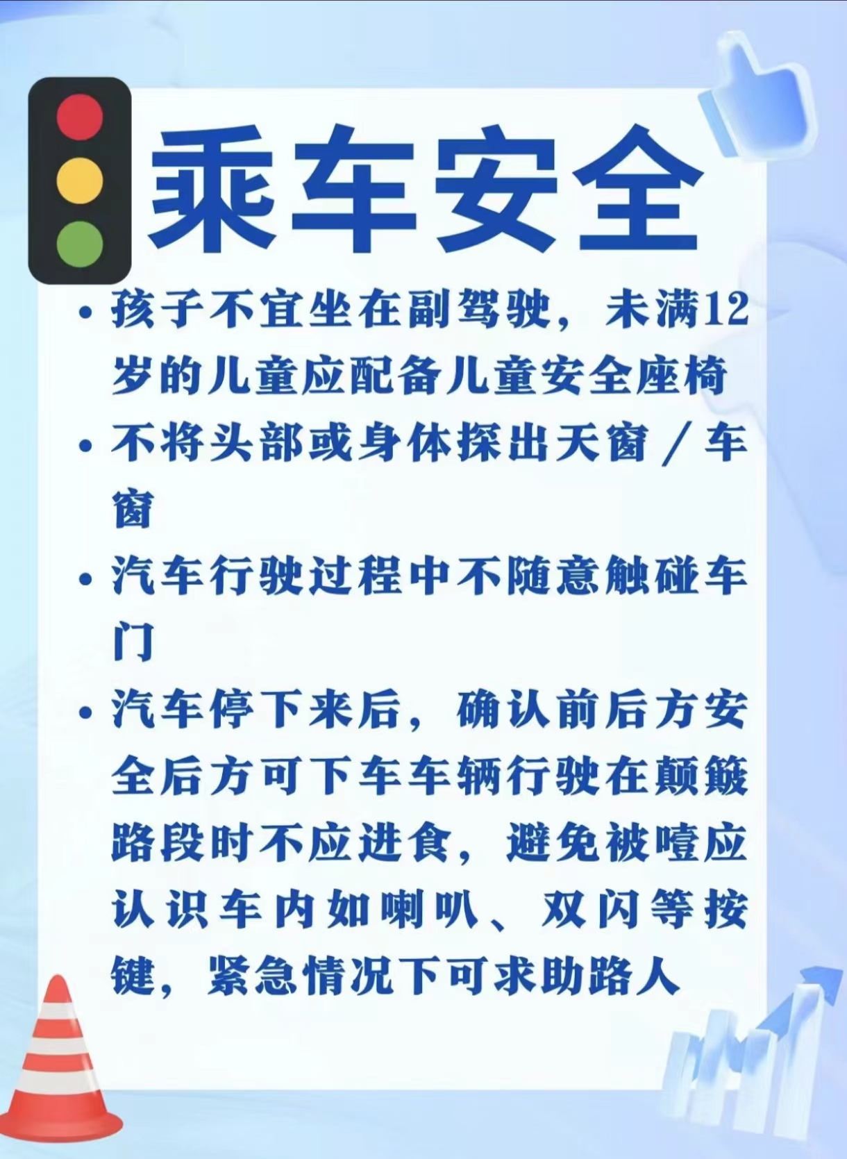 (5)不要在道路上拦车、追车、扒车或抛物击车。