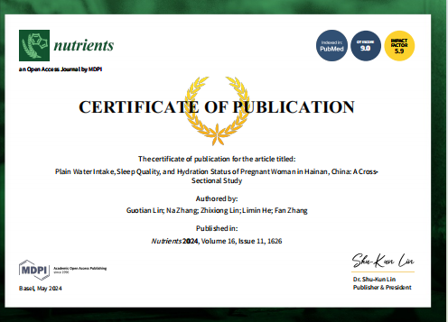 今日,新葡的京集团350vip8888/新葡的京集团350vip8888医学检验专业教研室与海南医公司张帆教授团队、北京大学张娜研究员团队合作,在中科院二区《Nutrients》(IF=5.9)发表题为:“Plain Water Intake, Sleep Quality, and Hydration Status of Pregnant Woman in Hainan, China: A Cross-Sectional Study”的研究论文。研究提示孕妇的水合状态可能受到日常白水摄入量和睡眠质量的影响,同时中国孕妇的饮水量不足,因此,对孕妇进行充足饮水的教育对她们的健康有益。(原文链接:https://www.mdpi.com/2072-6643/16/11/1626)