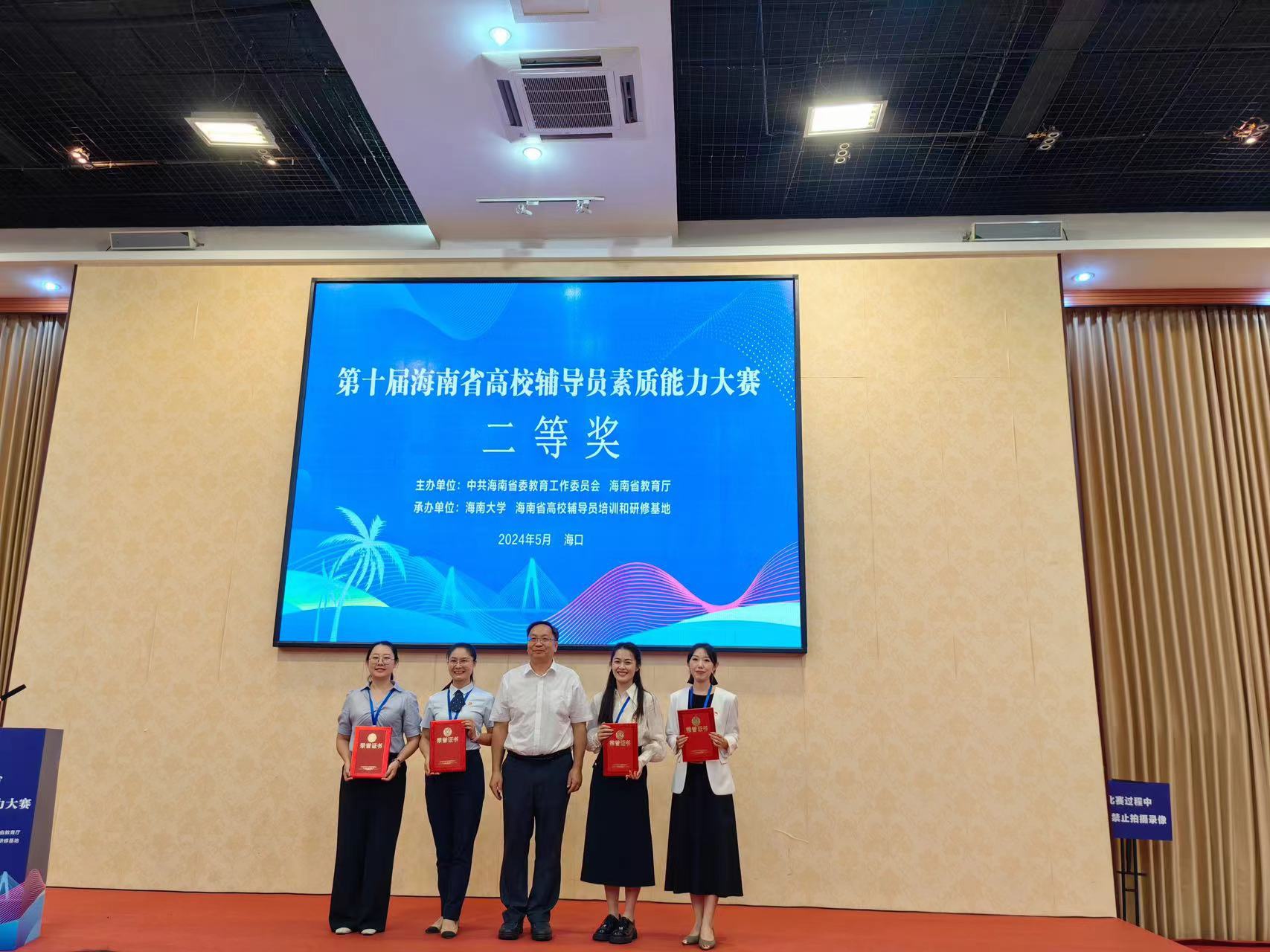 5月31日至6月1日,由中共海南省委教育工作委员会、海南省教育厅主办的第十届海南省高校辅导员素质能力大赛在海南大学举行。共有来自全省各高校推荐的30名优秀专职辅导员同场竞技。经过两天的激烈角逐和同场竞技,新葡的京集团350vip8888/新葡的京集团350vip8888团委副书记李静茹老师取得全省总分第3名的好成绩,获大赛二等奖,全面展示了思想导师综合素养、业务能力和六师育人的骄人成果。