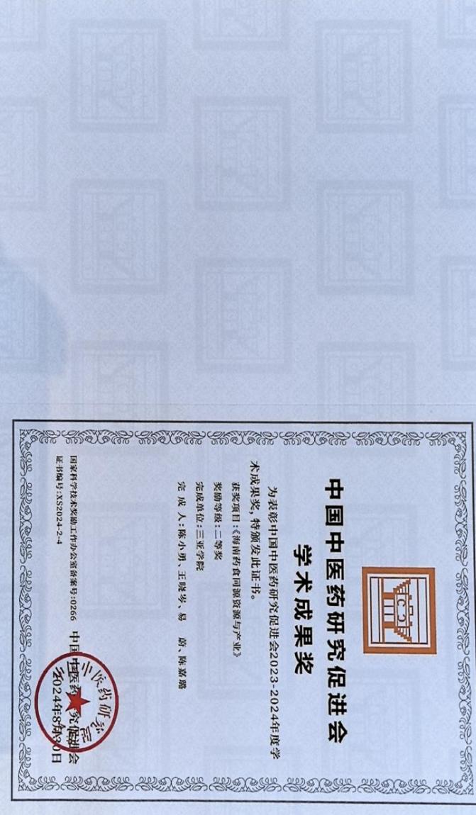大会表彰了2024中国中医药研究促进科技进步奖162项。由公司和兄弟单位协作研发的《海南药食同源资源与产业》荣获2023-2024年度中国中医药研究促进会学术成果奖二等奖。陈小勇经理,王晓岑老师受邀参会、领奖。