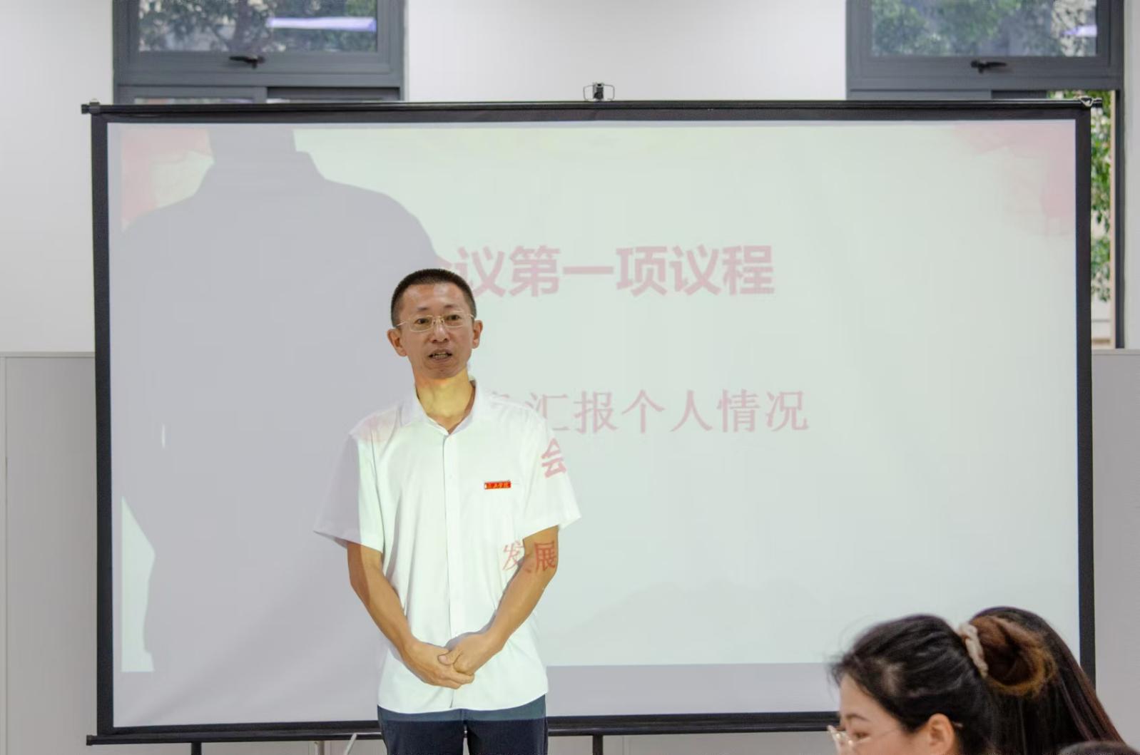 会议第一项议程请发展对象姚晶鑫同志汇报预备期间的思想、工作情况