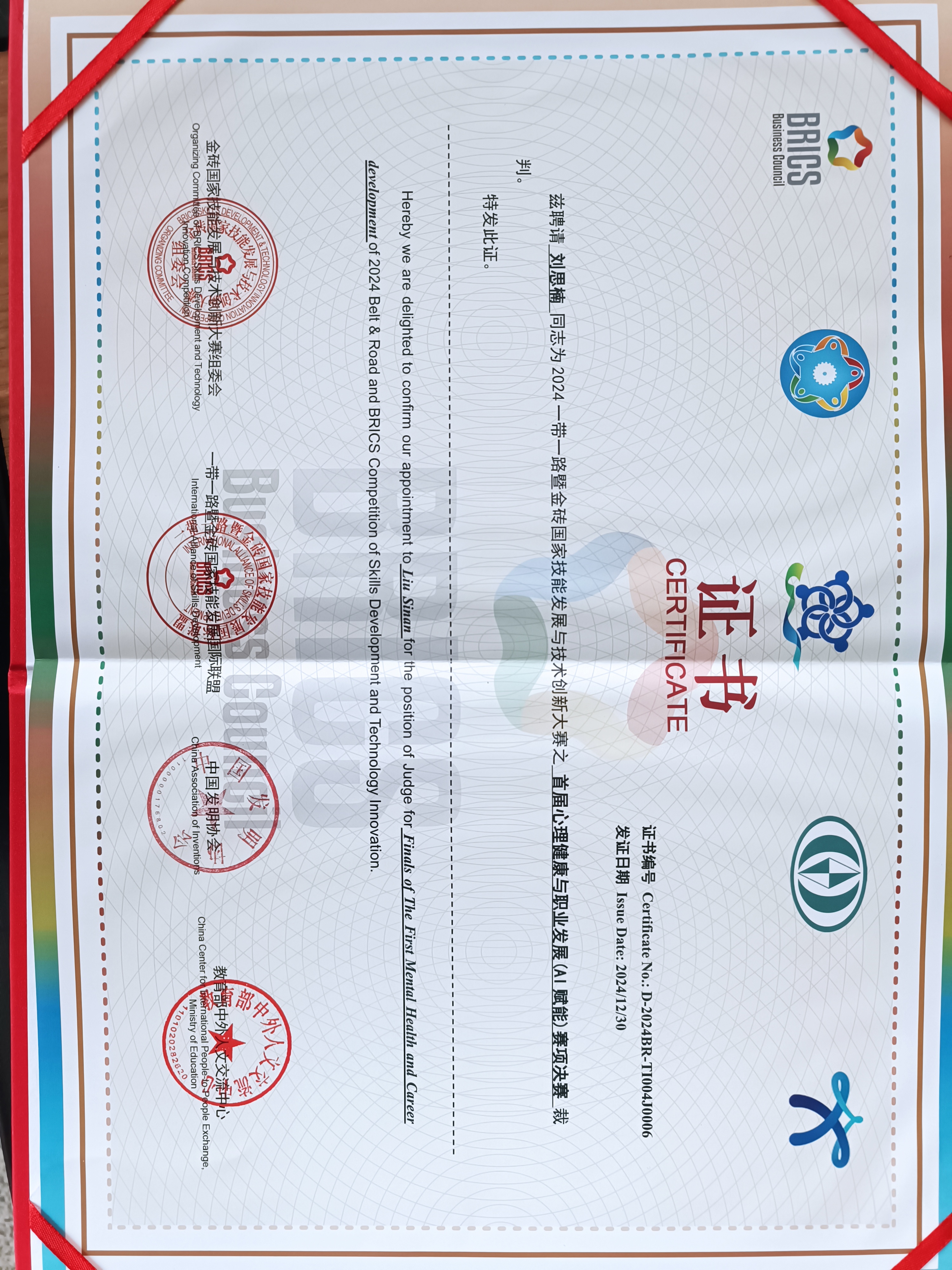 (刘思楠教师担任2024“一带一路”暨金砖国家技能发展与技术创新大赛首届心理健康与职业发展(AI赋能)赛项决赛裁判员聘书)