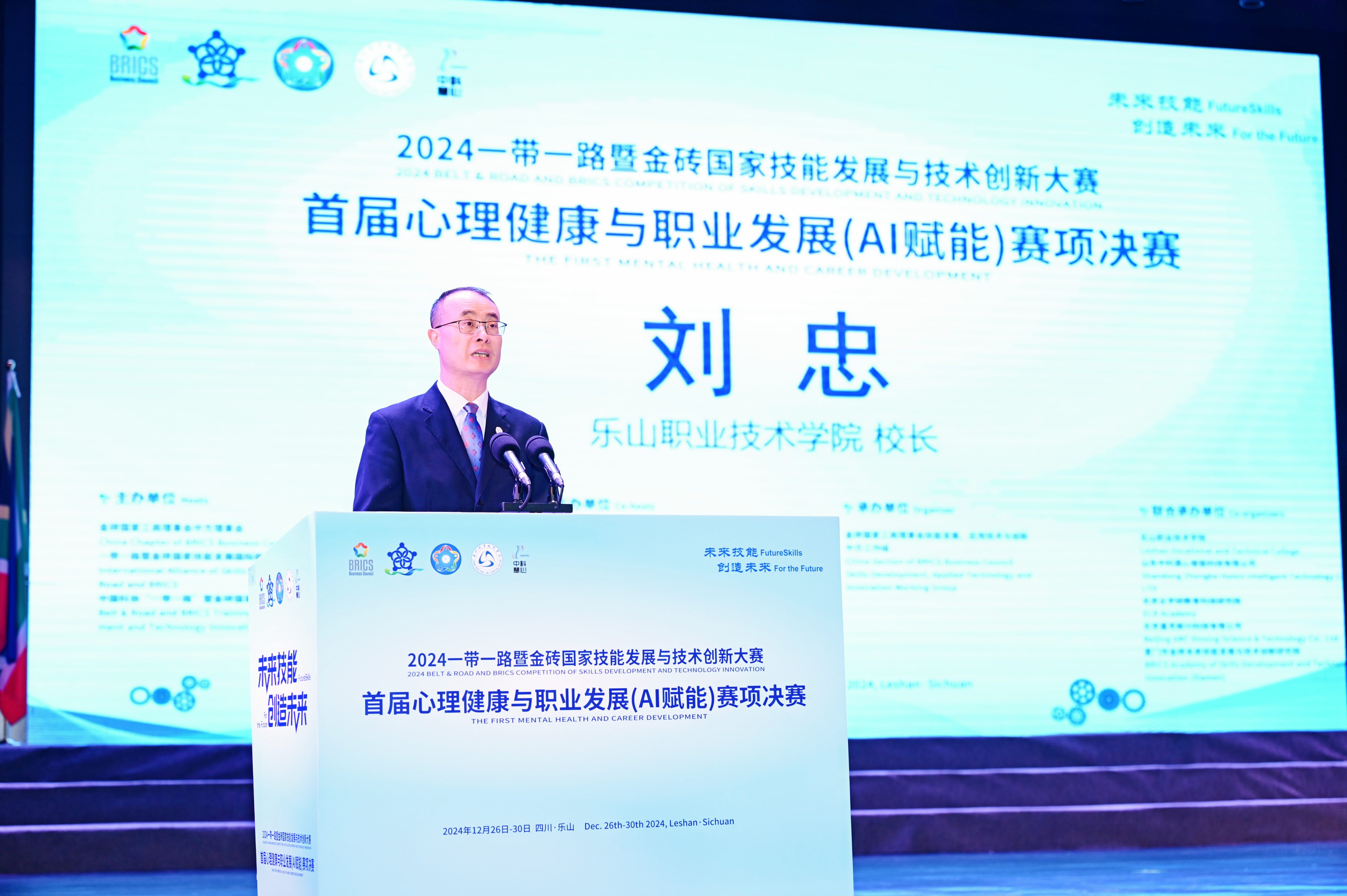 会上乐山职业技术公司董事长刘忠致辞,他表示本次赛项旨在进一步加强职业院校心理健康教育工作,培养AI赋能的专业素养,推动我国职业教育心理健康与人工智能融合高质量发展。