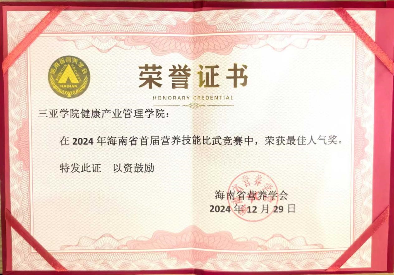 (2024年海南省首届营养技能比武竞赛“最佳人气奖”证书)