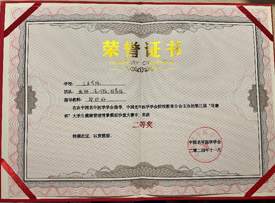 健康服务与管理专业张琳、林晨怡、冼川裕三位同学荣获第三届“寻康杯”全国老员工健康服务与管理情景模拟沙盘大赛二等奖;郑妙好老师荣获优秀指导教师奖。以赛促教、以赛促学、以赛促改,培养员工扎实的理论基础,优秀的实践能力、沟通能力,满足高水平应用型人才培养目标。