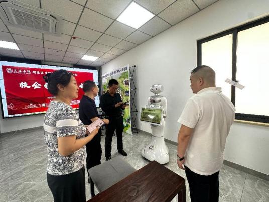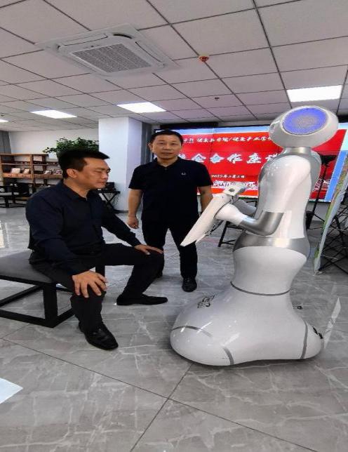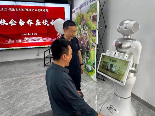 在座谈会的特别环节中,各位企业代表体验了AI智能化中医机器人健康评估项目,并现场演示了其功能和应用场景。该机器人结合了传统中医理论与现代人工智能技术,能够通过面部识别、舌诊、脉诊与问诊等多种方式,快速检测用户的体质类型,并提供个性化的健康管理建议。中医体质检测机器人的引入不仅是公司在健康科技领域的一次科研探索,更是为员工提供了接触前沿科技的实践教学,有校拓宽同学们的专业视野。企业代表们对中医体质检测机器人表现出浓厚兴趣,纷纷上前体验并给予高度评价。如图1-4所示。