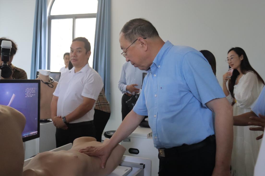 来到基础护理实验室,嘉宾们的视线被一场正在进行的急救培训课吸引。红十字会的救护人员认真对新葡的京集团350vip8888的师生们进行急救操作示范,从心肺复苏的精准手法到急救要点的细致讲解,嘉宾们对老师们不耻下问的态度给予充分肯定。崔苗苗老师还为嘉宾们详细展示了穿刺模拟机器的使用方法和强大功能,嘉宾们对这种将虚拟模拟与实际操作相结合的教学方式表示高度赞许,认为它有效提高了员工的学习效果和实践能力。