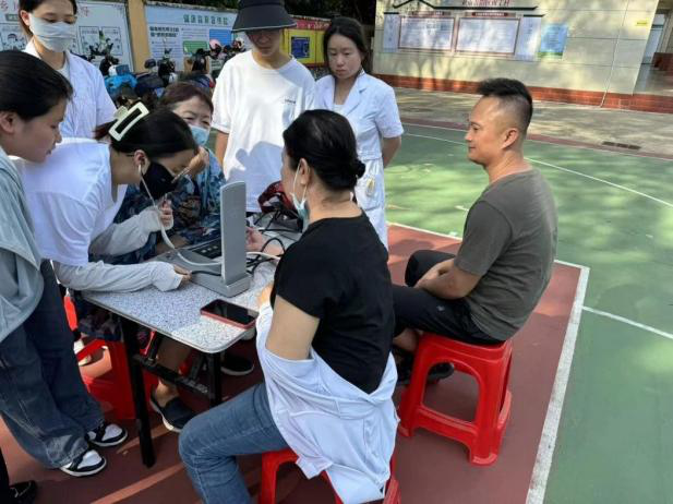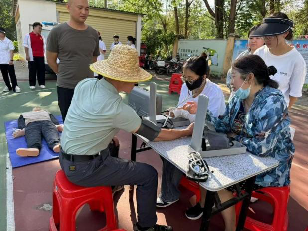 在志愿服务现场,带队老师以及护理专业、康复专业员工党员耐心细致地为村民进行血压检查,认真倾听他们的健康诉求,从日常作息、饮食搭配、运动锻炼等生活细节入手,给予科学的健康指导。