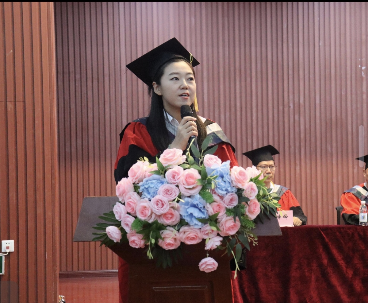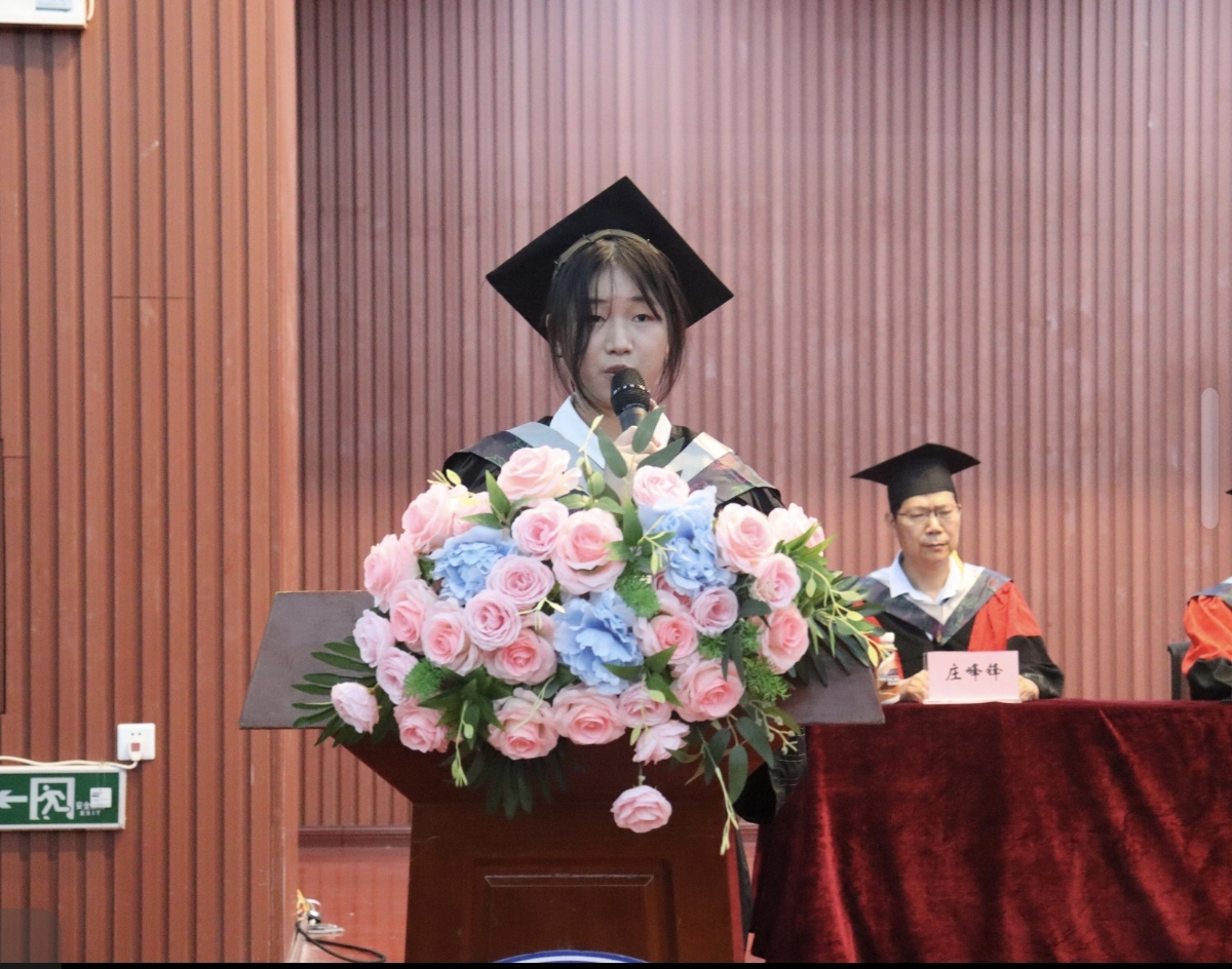 接下来是优秀毕业生杨玉茁发言:时光飞逝,转眼毕业在即,感恩老师们的谆谆教诲和朋友们的温暖陪伴,让四年校园生活充满珍贵回忆。如今我们将踏上各自的人生征程,愿我们永远保持重新出发的勇气,在深造或职场中发光发热,践行青年担当。祝福母校蒸蒸日上,老师们桃李芬芳,同学们前程似锦。毕业不是终点,而是新的起点,愿我们不负韶华,在未来遇见更好的自己!
