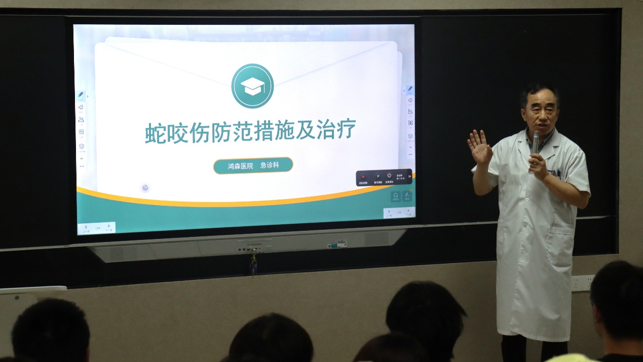 在海南地区蛇类资源丰富且活跃度高,毒蛇与人类活动区域重叠风险较高。三亚哈尔滨医科大学洪森医院急诊科主任副主任医师李玉柱主要对员工们讲述了常见蛇的种类及毒蛇的种类及外形,以及被毒蛇咬伤后该怎么样去处理伤口,若被咬伤应立即用清水冲洗伤口,近心端结扎,切勿奔跑或吮吸毒液,并迅速前往有抗蛇毒血清的医院。