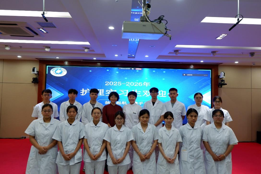 欢迎会上,王丹心主任结合自己多年的临床带教经验,对实习生们提出了殷切期望,她特别强调,希望同学们在为期一年的实习中,不仅能够提升专业技能,更能收获成长与感动,为未来的职业生涯打下坚实基础。优秀教学组长代表产科二病区副护士长王少婷以同行者的身份分享了“患者信任是临床路上最珍贵礼物”的感悟。急诊和创伤外科副护士长张庆作为优秀学姐代表,以亲身经历提醒学弟学妹们“严谨与共情并重”。热烈的欢迎会为护理实习生们开启了职业成长的大门。接下来为期一周的岗前培训课程,以“专业、实践、人文”为主线,助力实习生尽快完成角色转换,夯实专业根基、掌握临床实践本领,从校园迈向临床的第一步走得更稳、更扎实。在为期6个月的实习过程中,医院还会通过轮岗带教、定期专题座谈、座谈会等方式护航职业发展,为培养"技术精湛、德才兼备"的新时代护理人才而不懈努力。参加欢迎会的还有来自海南医科大学和海南科技职业大学的老师和护理实习生。